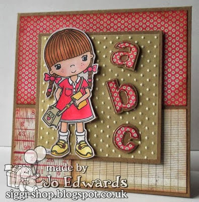 Next is Jo's darling card. Another sweet image with really nice coloring and cutting. The letters look fabulous. The ledger and tape measure papers look great.